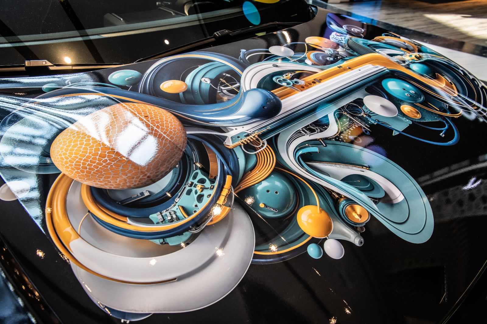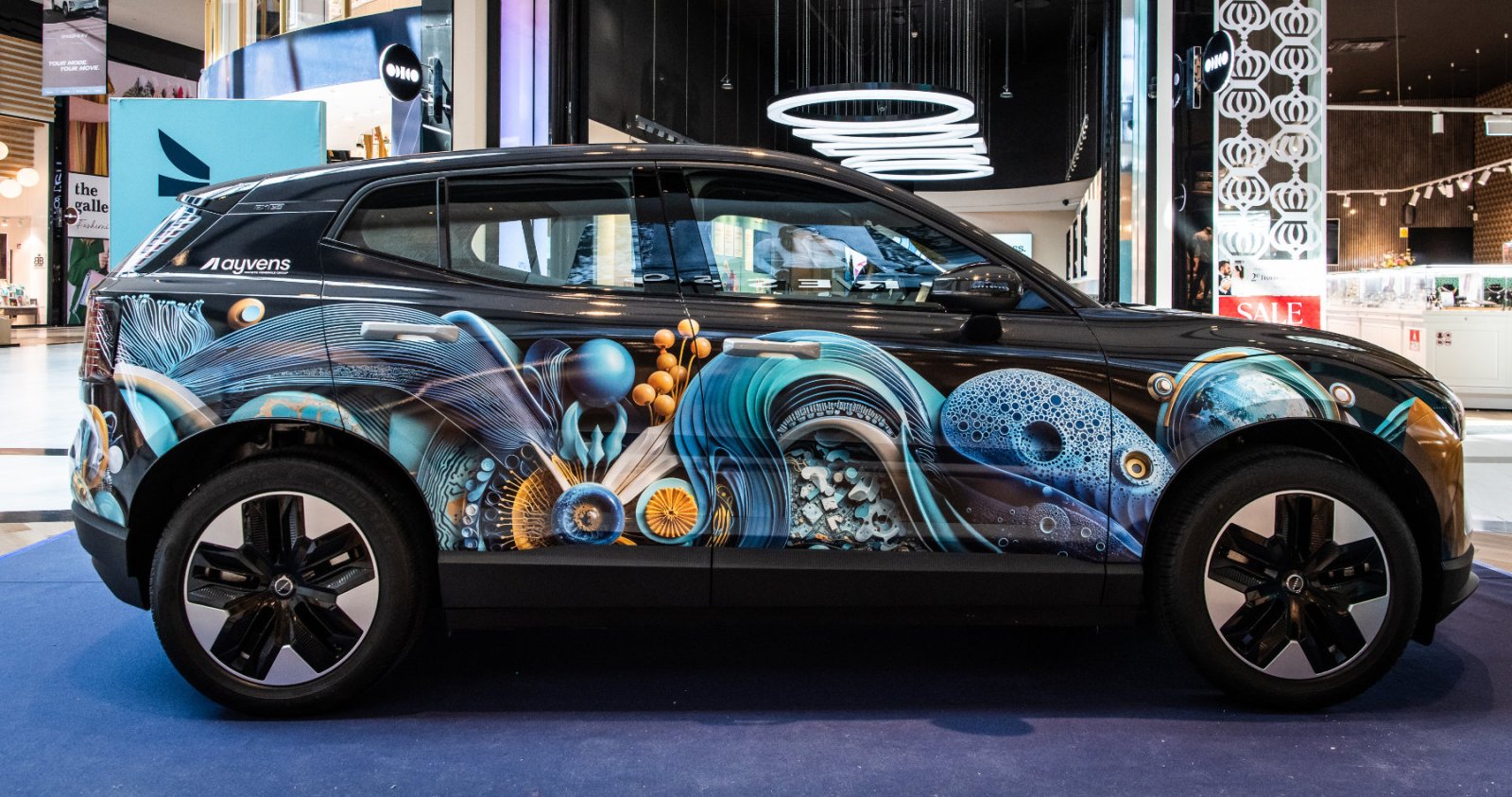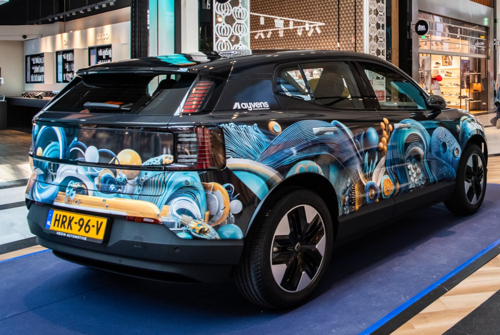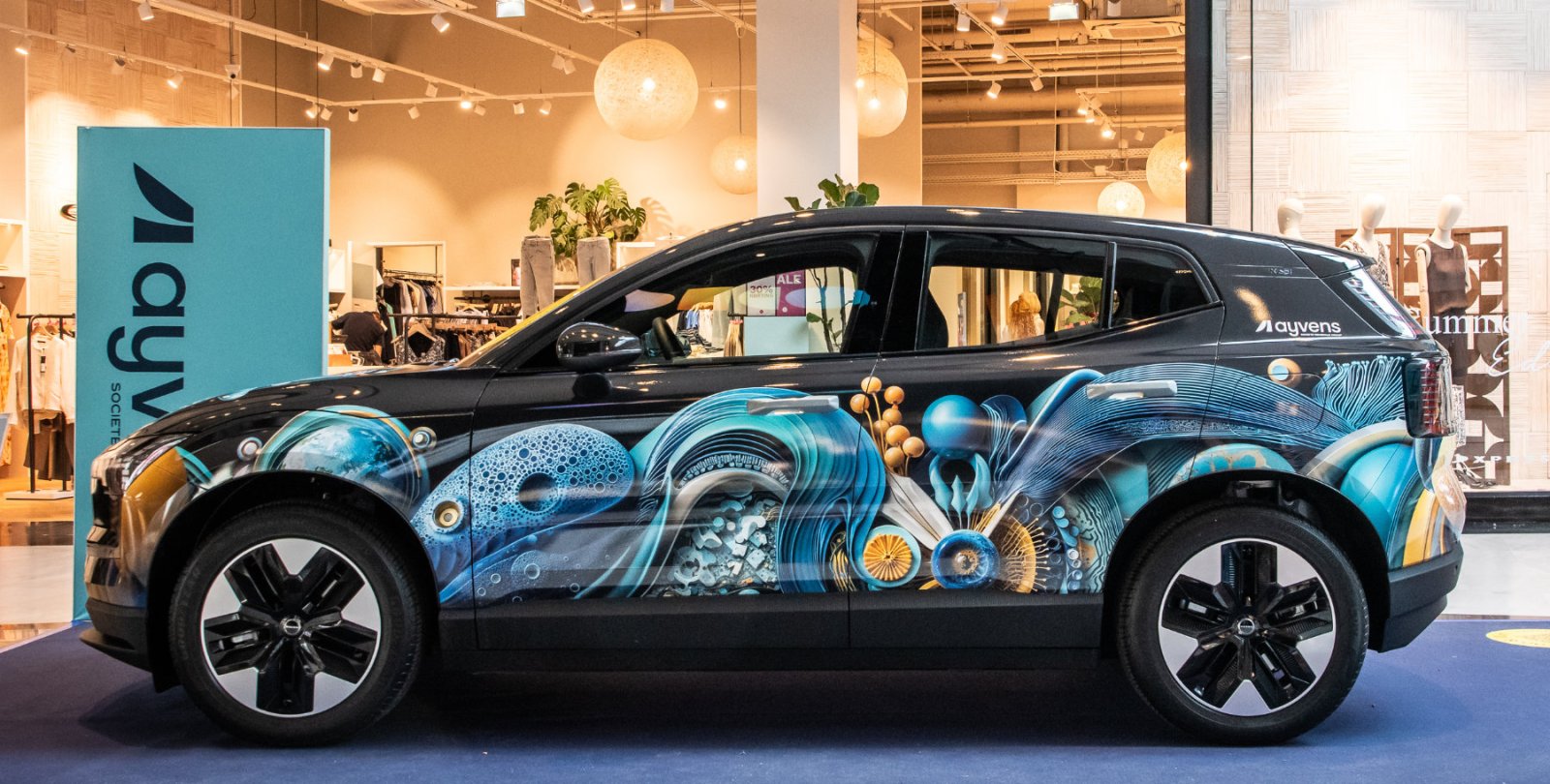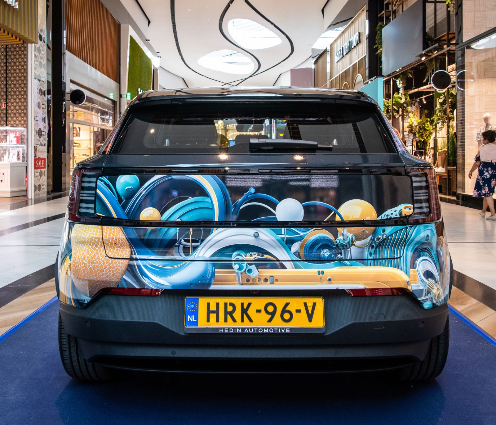 To celebrate Ayvens' first anniversary in the Netherlands, artist Jaxon Nash designed this custom car wrap for the Volvo EX30. Titled The Future Moves, the work is a visual response to Ayvens' themes: greener, easier, and more flexible mobility.