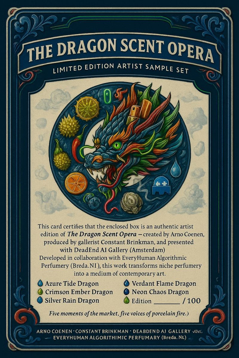 The Dragon Scent Codex is een parfumbox van Arno Coenen met vijf artistieke geuren (5 × 5 ml). De collectie bestaat uit vijf afzonderlijke parfumwerken die samen één narratief vormen: een dag in Taipei, vertaald naar geur.